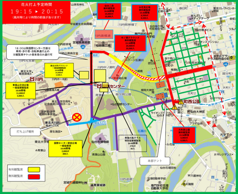 - 広瀬通りと西公園通りは歩行者天国となり花火観覧が可能