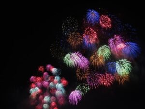 - 創作花火:オリンピックの五輪を模した花火など、独創的な花火が楽しめます。