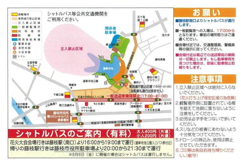 公共交通機関やシャトルバスを利用し、楽しい花火大会を楽しんでくださいね。