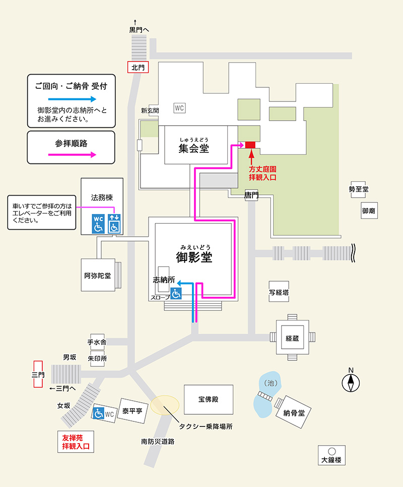 - ライトアップでは三門、友禅苑、女坂などが幻想的に照らされる