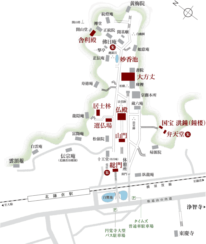 - JR東海道線「鎌倉駅」からJR横須賀線に乗り換え、北鎌倉駅下車(所要時間約3分)