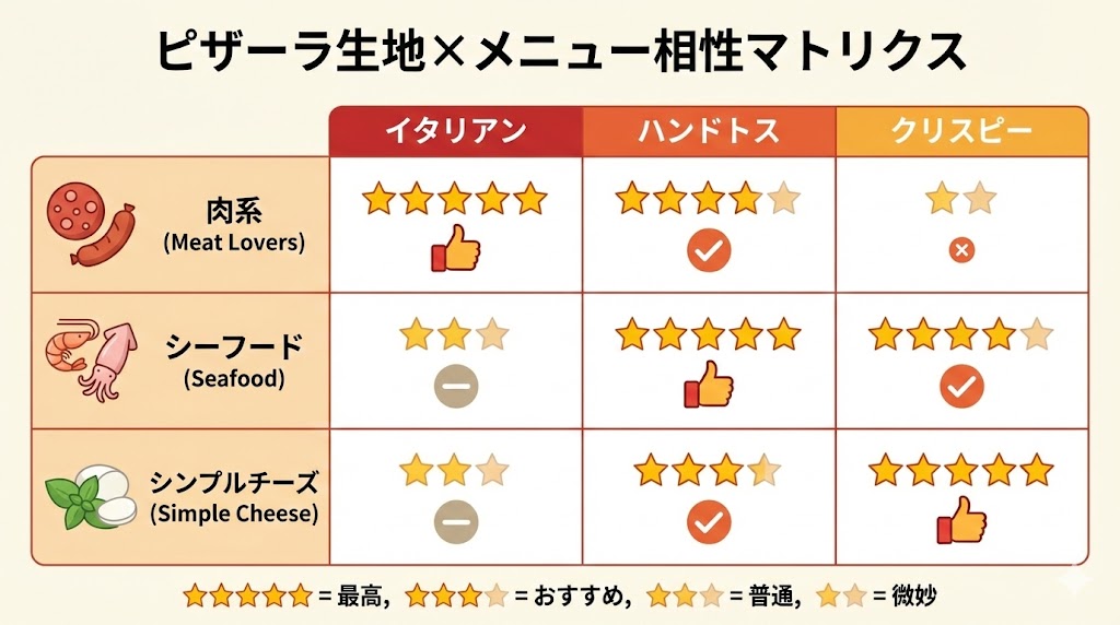 生地の特徴がわかったところで、次は「どのピザにどの生地を合わせるか」という実践的な選び方をご紹介します。