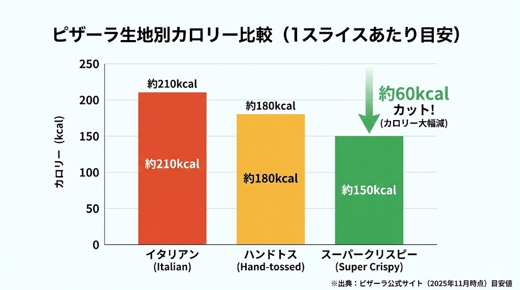 このように、イタリアンとスーパークリスピーでは、1ピースあたり約40kcal前後の差が出ることがあります。