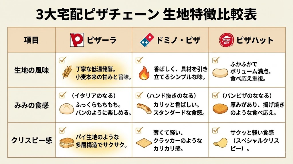 特にピザーラは、他社とは少し違う独自の生地ラインナップを持っているため、それぞれの特徴を正しく知ることが重要です。