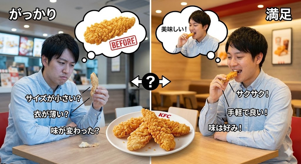 サイズや肉質の変化でがっかりする声がある一方で、「骨なしで食べやすい」「衣のザクザクが好き」という支持も根強く、向き・不向きがはっきり分かれるメニューになっていると考えるとわかりやすいです。
