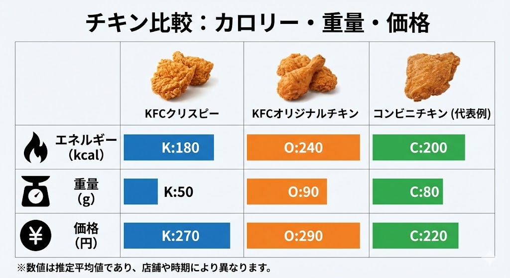 • オリジナルチキンや他チキンとのカロリー・量・価格の比較から見える立ち位置