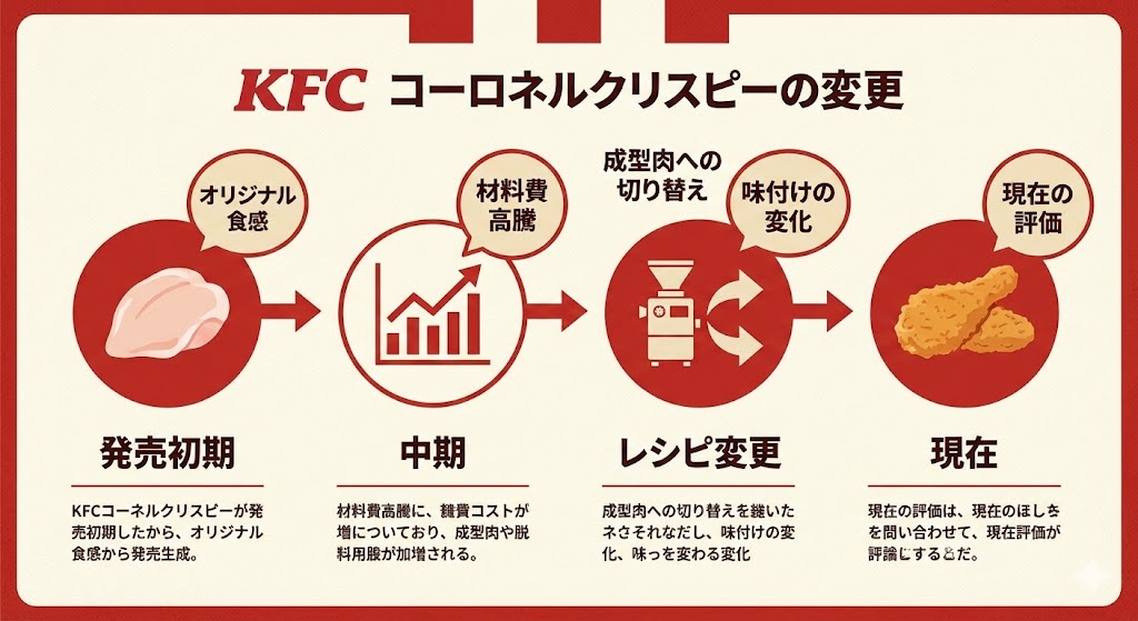 チキンに限らず、多くの食品が「値段は上がるのに、中身は少しずつ小さくなる」という流れの中にあるため、クリスピーだけが特別というより、時代全体の変化も影響していると考えられます。