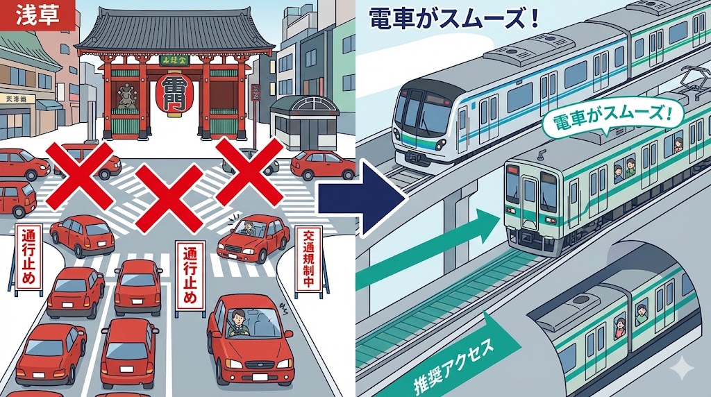 浅草寺のすぐ近くまで車で行くのではなく、数駅離れた場所の駐車場を利用し、そこから電車で移動する方法です。