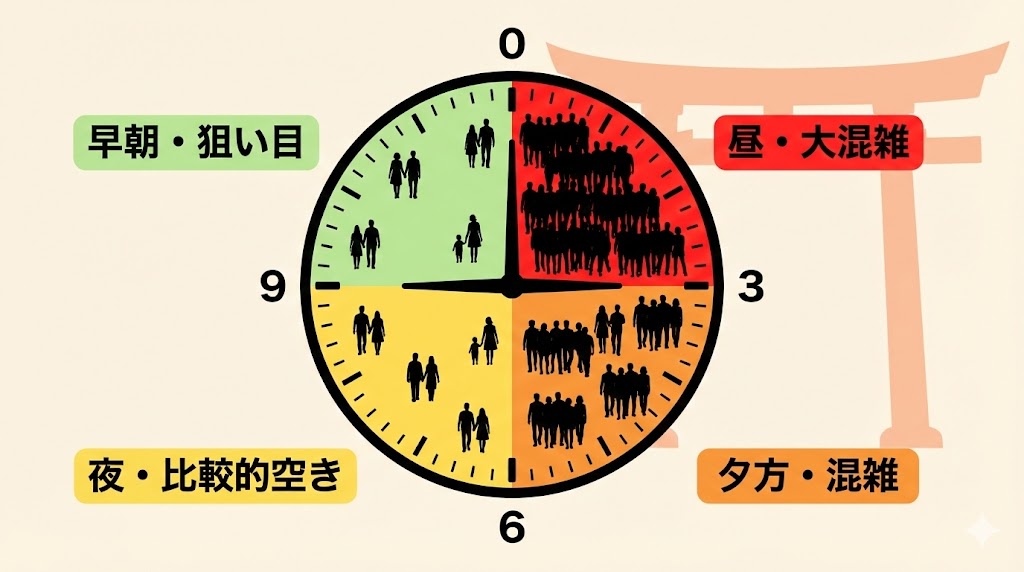 A. 三が日を外した平日の早朝(6〜8時台)が、最も人の途切れ目を狙いやすい時間帯です。三が日に行く場合は、夜遅めの時間帯か、4日早朝などを候補にすると、日中よりは落ち着いた雰囲気になります。