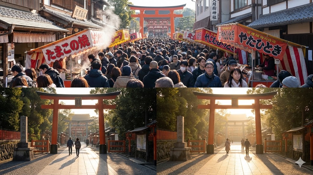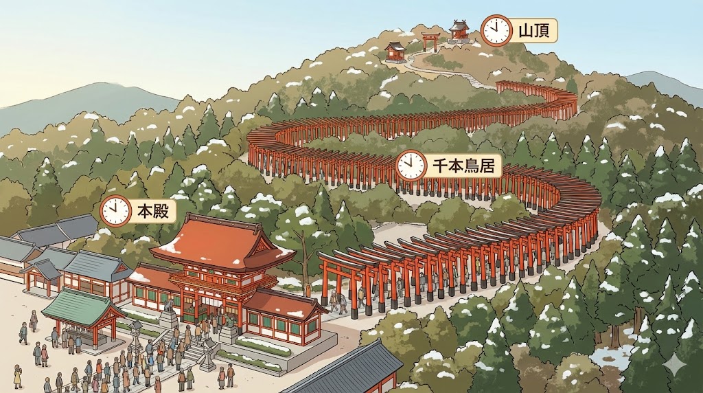 特に、三が日の日中は「写真を撮りたい人」「本殿だけでいい人」「山頂まで行きたい人」が一気に混ざるため、千本鳥居付近の“ボトルネック”感が出やすくなります。