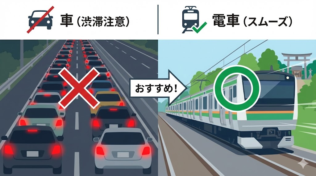 混雑と渋滞を回避してスマートに参拝するには、「どの駅を利用するか」、あるいは「どこまで車で行って電車に乗り換えるか」という戦略が勝敗を分けます。