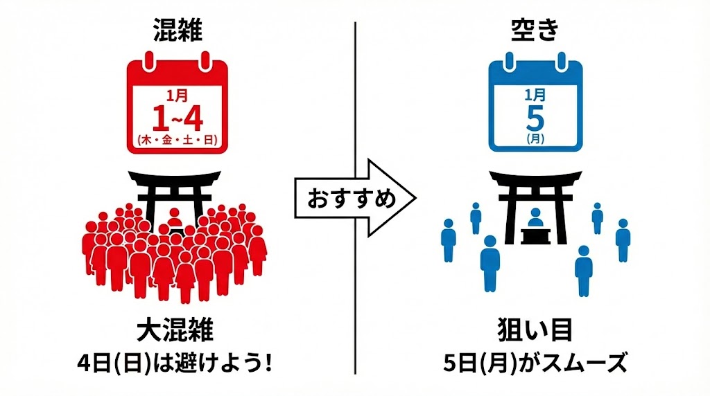 2026年の初詣において、混雑回避の最大のカギは「1月4日(日)」の扱い方にあります。