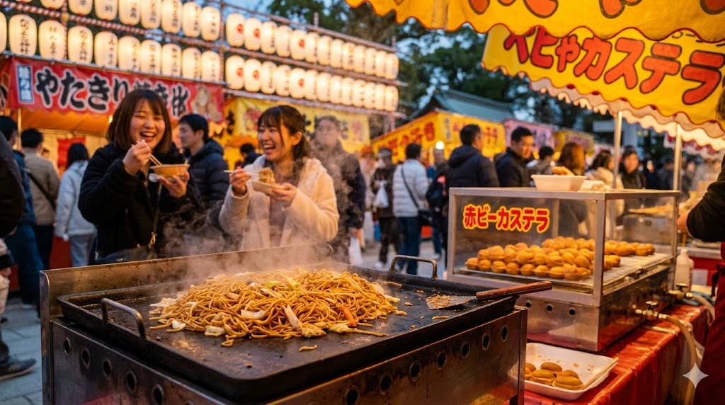 参拝を終えた後の冷えた体に、熱々のベビーカステラや焼きそばの香ばしい匂いは格別のご褒美となります。
