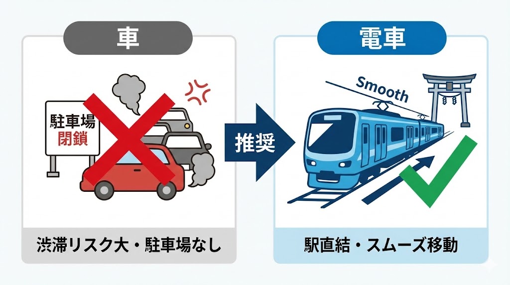 渋滞のイライラや駐車場探しのストレスから解放され、心穏やかに参拝するためにも、ぜひ公共交通機関の利用を第一に検討してください。