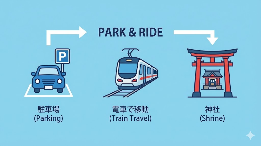 この渋滞地獄を回避する唯一にして最強の手段が、少し離れた場所に車を停めて公共交通機関で移動する「パーク&ライド」です。
