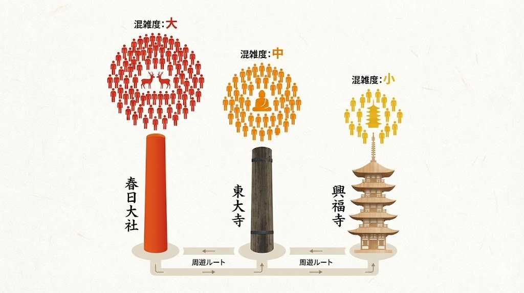 これらの情報を組み合わせることで、「今は並びが激しいから、先に興福寺へ行こう」といった柔軟な判断が可能になります。