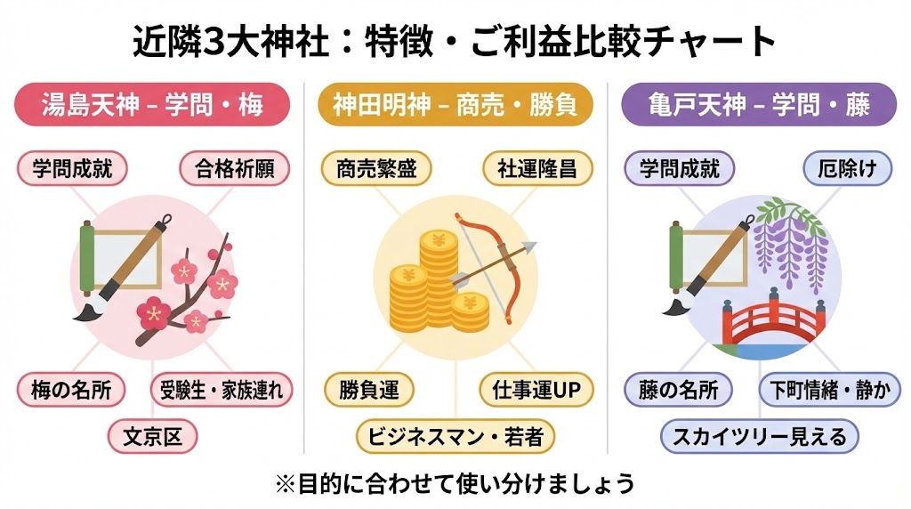 | 項目 | 湯島天神 | 神田明神 | 亀戸天神 |
