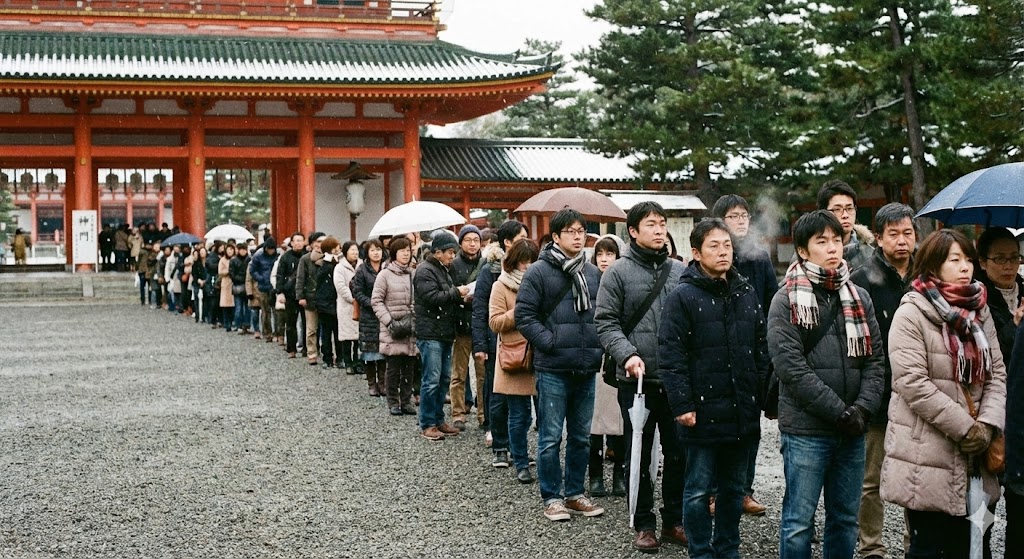 多くの人が一斉に押し寄せるため、参道には長い列ができ、参拝までに30分以上待つこともあります。