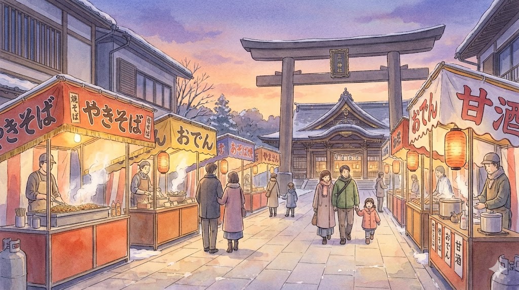 この時期に訪れると、静かな雰囲気の中で参拝ができるほか、屋台や境内をゆっくりと楽しむことができます。