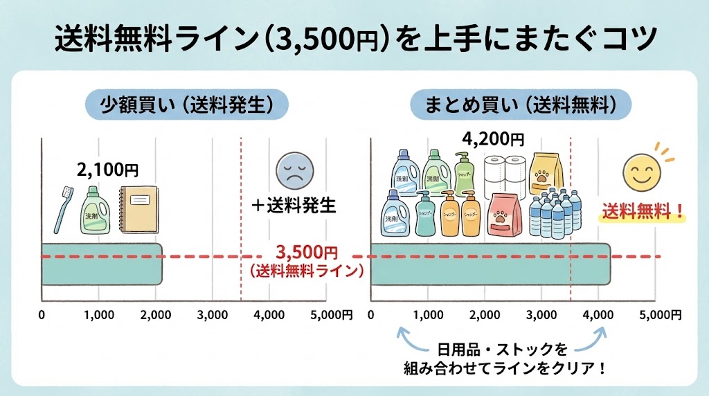- 日用品や定期購入品は、注文の頻度とまとめ方を工夫することで、無駄な送料を減らしやすくなる