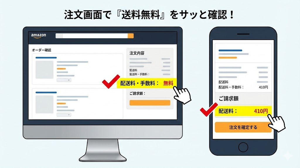 - 注文画面では、商品ページのPrimeマークと出品者、カートの送料表示、注文確定画面の内訳を順番に確認するのが安心