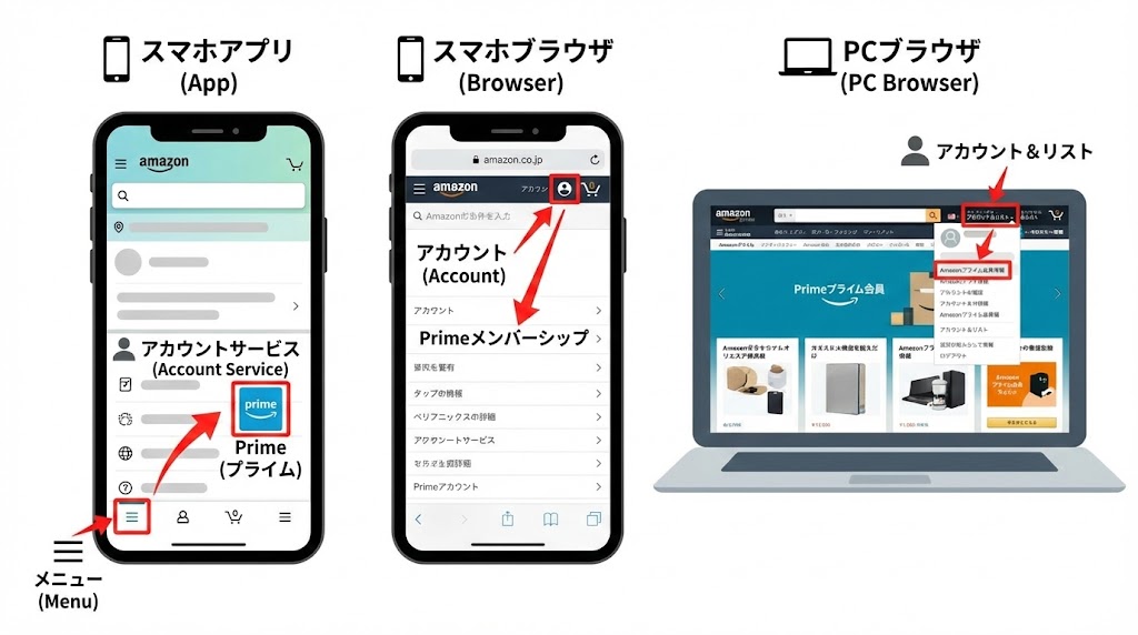 | スマホブラウザ | 三本線メニュー → アカウント → プライム | 会員ステータス・無料体験表示 |