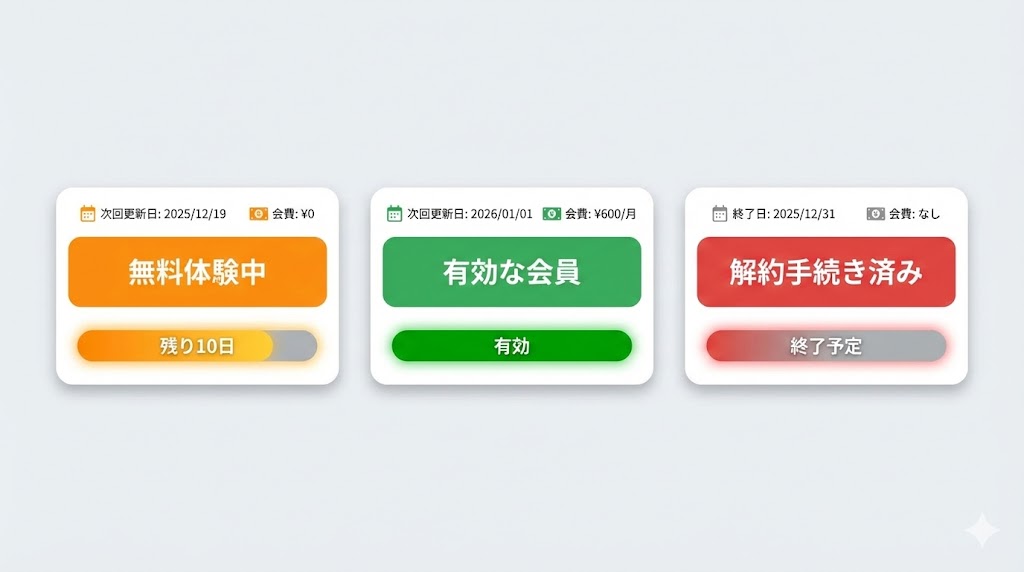 - ステータス画面では「無料体験」「有効会員」「解約済み」といった状態が表示される