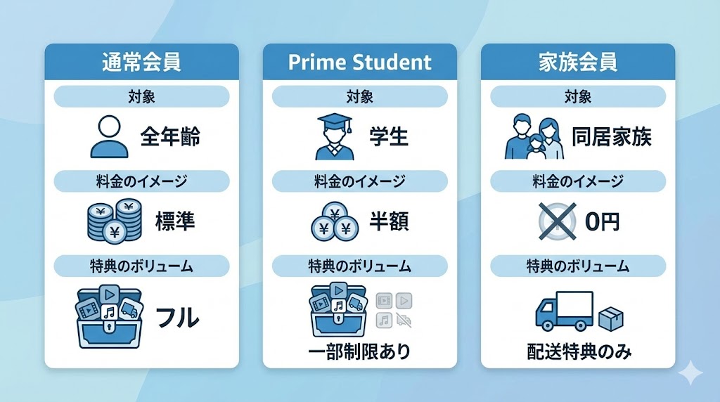 プラン別に確認したいポイント 通常会員・Prime Student・家族会員の違い