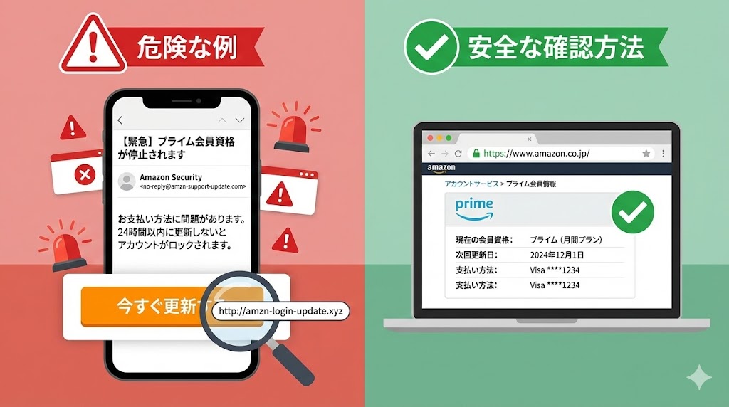 Q. 「プライム更新のお知らせ」というメールが本物か不安です。どう確認すればいいですか?