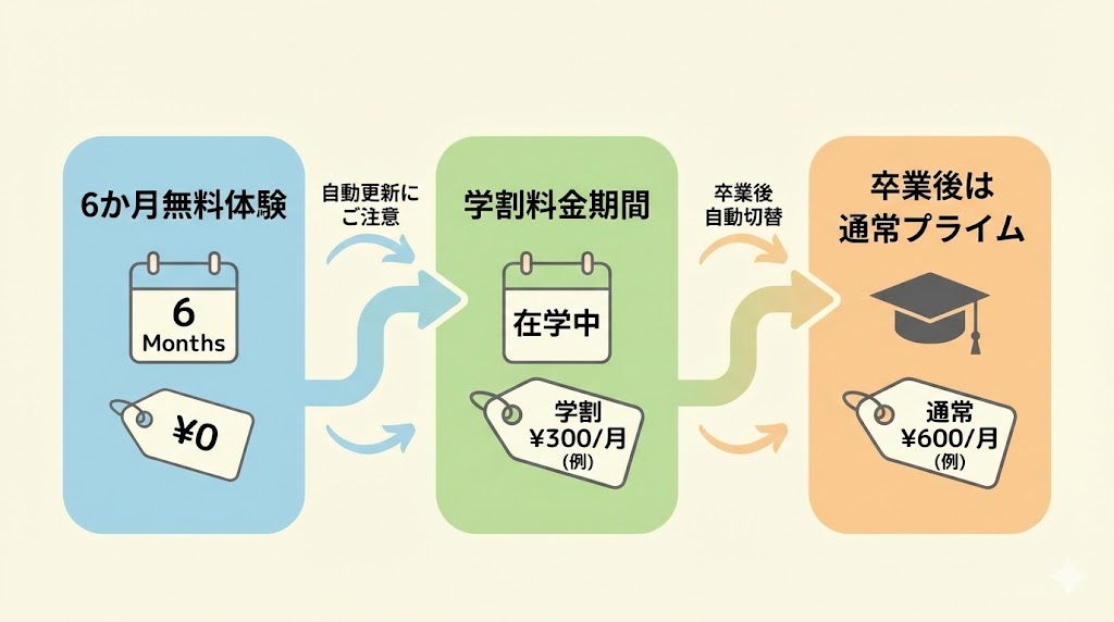 6か月無料体験と学割料金のしくみ(通常プライムとの比較)