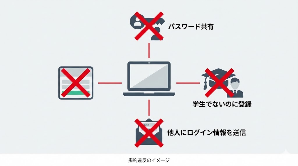- パスワード共有や、学生でない人が学生プランを使うといった行為は規約違反になる可能性があります。