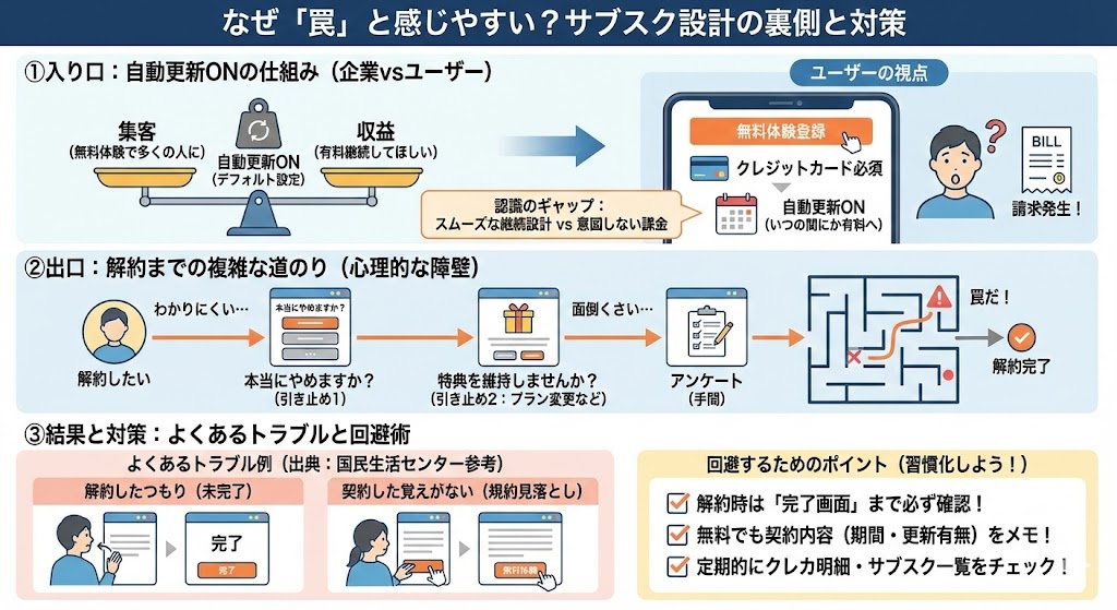 次に、「なぜこんなにも罠と言われがちなのか」を、サブスクという仕組みの面から見ていきます。