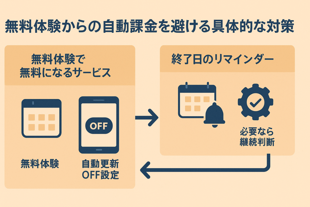 「登録したその場で自動更新OFF+カレンダーに終了日を書いておく」だけで、無料体験のいちばん大きなリスクはかなり減らせます。