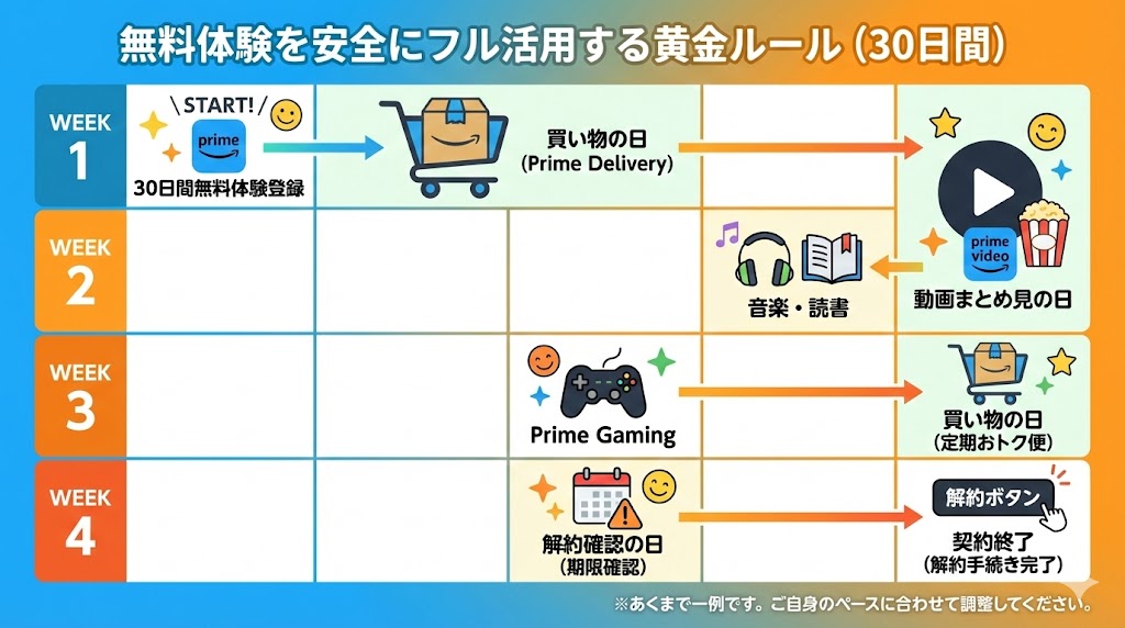 一番の近道は、「登録直後にやること」と「無料期間の終わり頃に確認すること」を決めておくことです。
