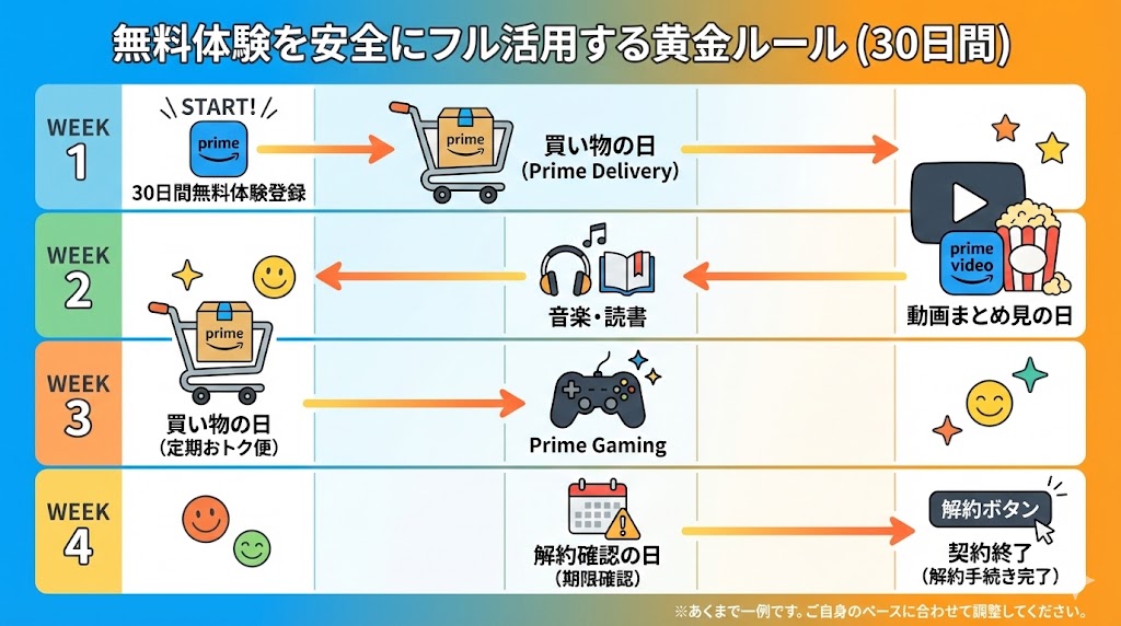 無料体験は、正しく使えば配送特典や動画・音楽などをじっくり試せる、かなり便利な仕組みです。