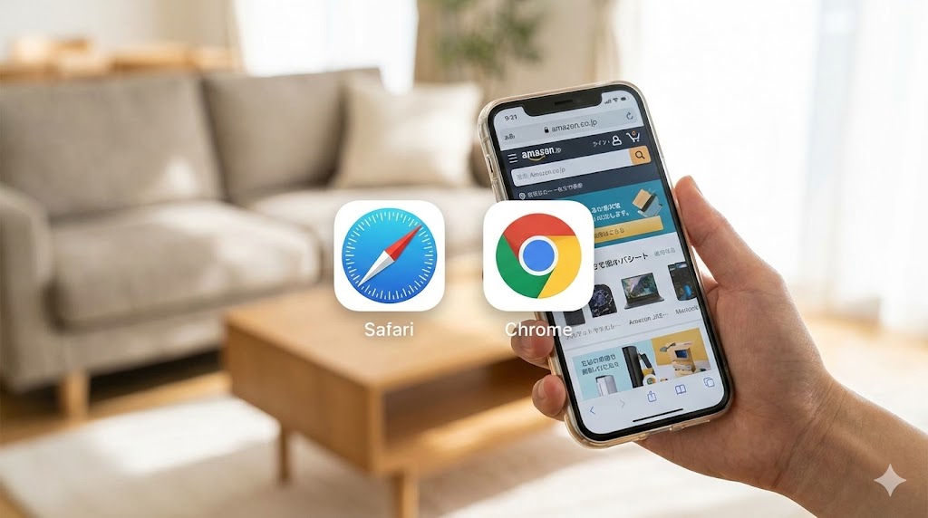 アプリでボタンが見つからない場合は、すぐにSafariやChromeなどのブラウザに切り替えてAmazon公式サイトを開きましょう。