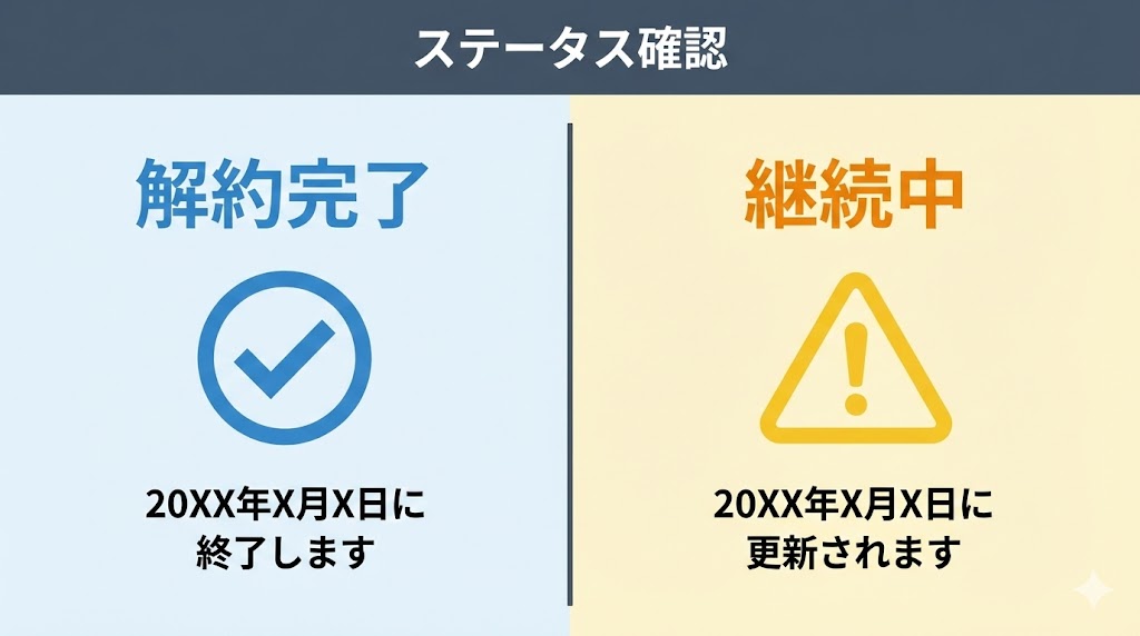 | 解約予約済み | すでに手続きが終わっている | 「終了します」の表示を確認 |