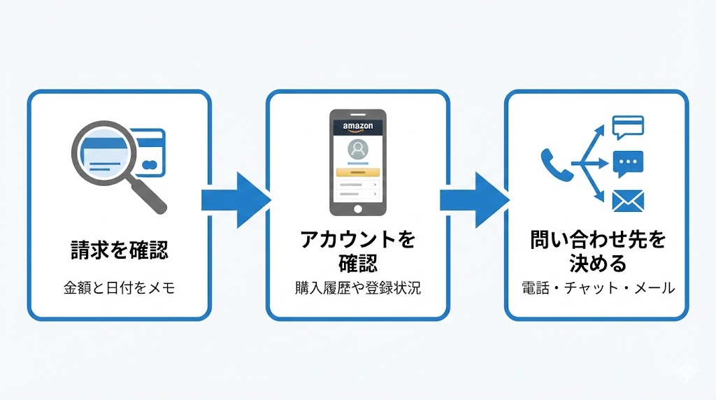 一言でいうと、「請求の中身を確認 → Amazonアカウントで照合 → 正規か不正かで問い合わせ先を分ける」の3ステップで動くとスムーズです。