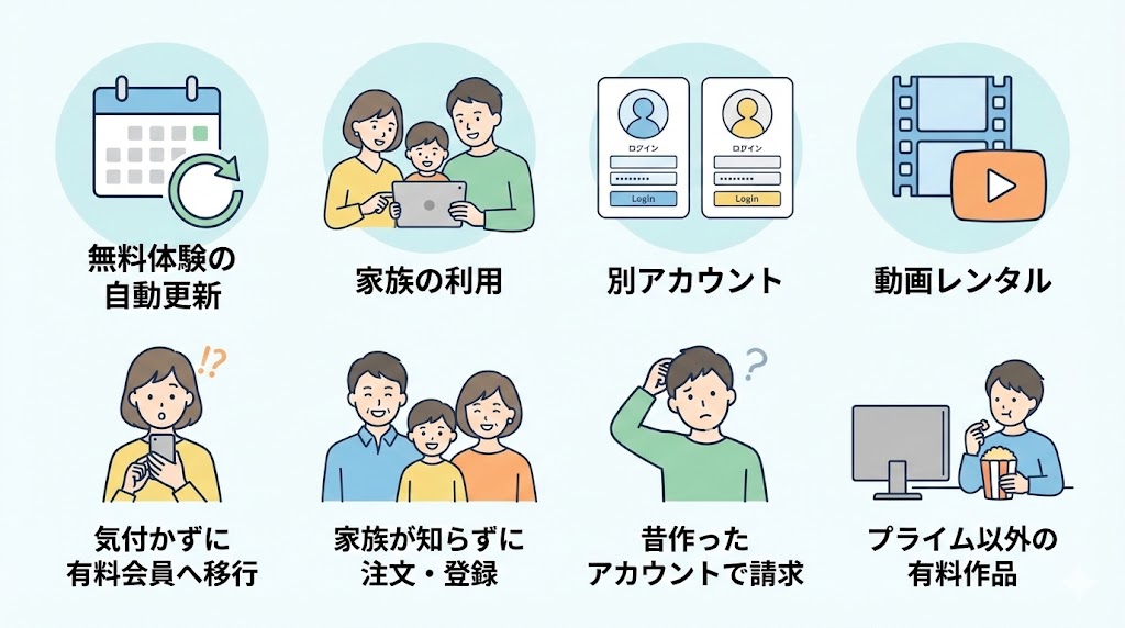 多くのケースは、無料体験の自動更新・家族や複数アカウントの利用・動画やデジタルコンテンツの課金など、いくつかの代表的なパターンに当てはまります。