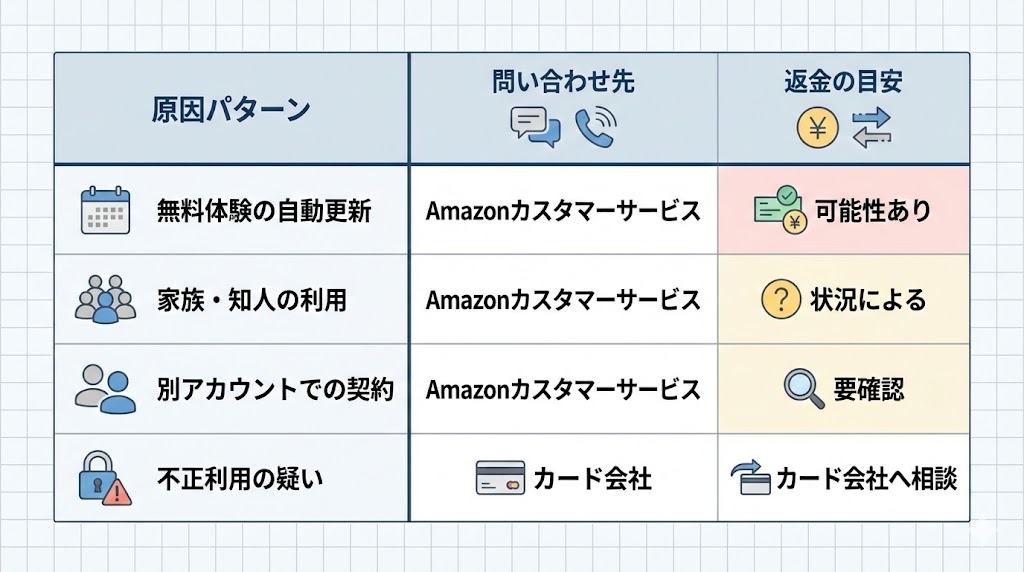 | 無料体験直後に初回請求 | Amazonカスタマーサービス | 利用状況次第で比較的高め |
