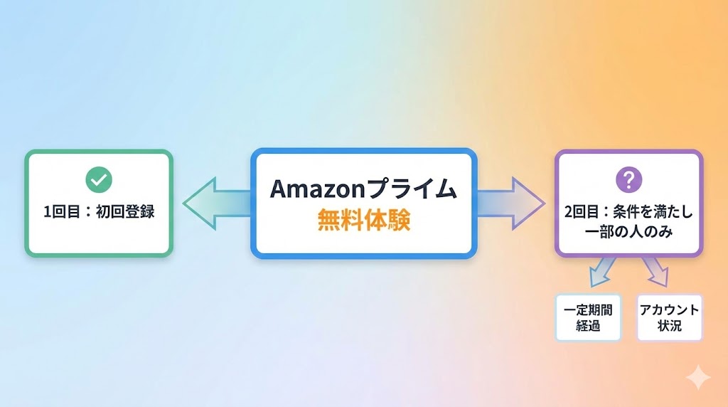 無料体験は基本的には1回までですが、Amazon側のキャンペーン判断で2回目が案内されることもあり、こちらから「いつ解禁されるか」を操作することはできません。
