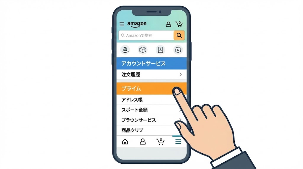 その中の「アカウントサービス」や「アカウント設定」にある「プライム」または「プライム会員情報」という項目をタップします。