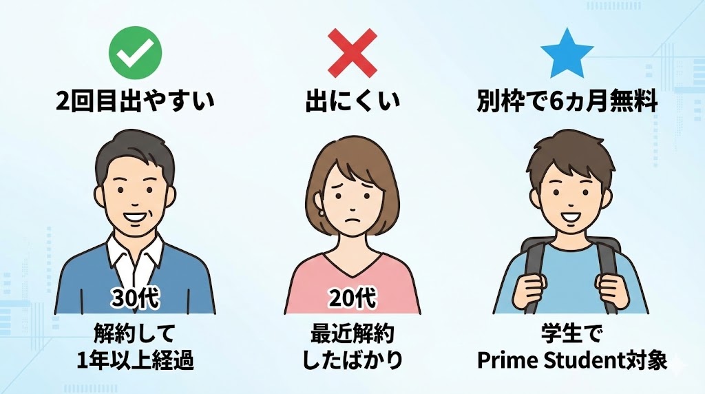 このように、「解約してから長く利用していないアカウントほど、キャンペーン対象になりやすい」と考えるのが自然ですが、あくまでAmazon側の判断であり、期間を満たしたからといって必ず出るわけではない点が重要です。