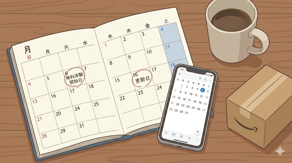 A. 登録直後に自動更新をオフにしておくのが一番安心です。 その場合でも無料期間が終わるまでは特典を使えるので、終了日だけカレンダーにメモしておくとよいです。