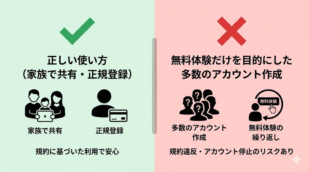 A. 無料体験だけを目的に多数のアカウントを作る使い方は、規約違反と判断されるリスクがあります。 正規の家族会員機能などを使って、1つのアカウントを中心に安全に共有する方が安心です。