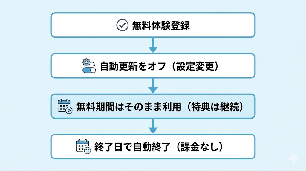 • 無料体験だけで終えたいときは、登録直後に自動更新オフ+終了日をメモしておくと安心。