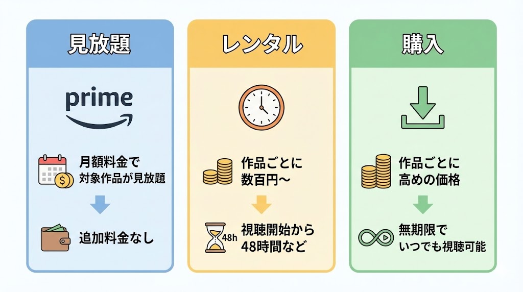 一言で動画を見ると言っても、プライム会員の見放題、期間限定のレンタル、ずっと残る購入では性質がまったく違います。