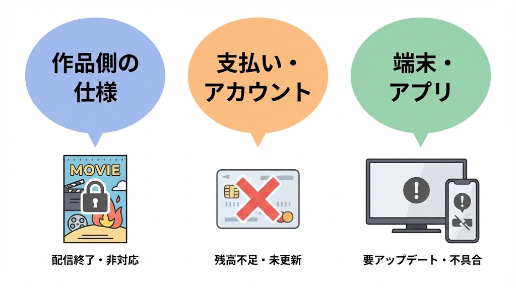 「この作品だけおかしい」と感じるときは、アカウント設定よりも先に、作品側の提供状況や地域制限の可能性を疑うのが近道です。