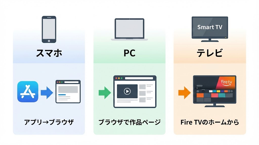 | スマホ | ブラウザ版Amazonで手続き→アプリで視聴 | アプリ内だけではボタンが出ないこともある |