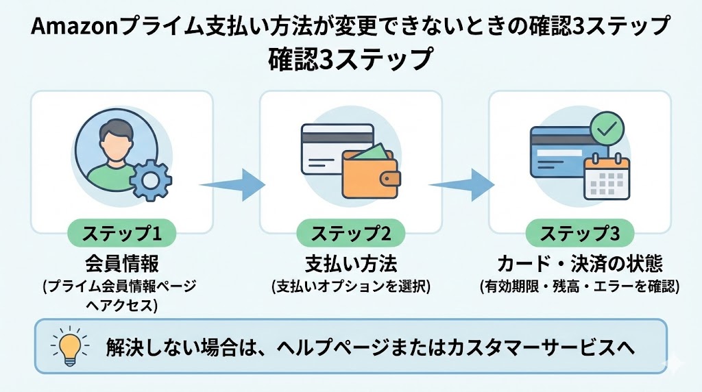 まずは、プライム会員情報ページから支払い方法の変更画面を開き、登録したいカードや決済手段が利用条件を満たしているかを順番に確かめるのが近道です。